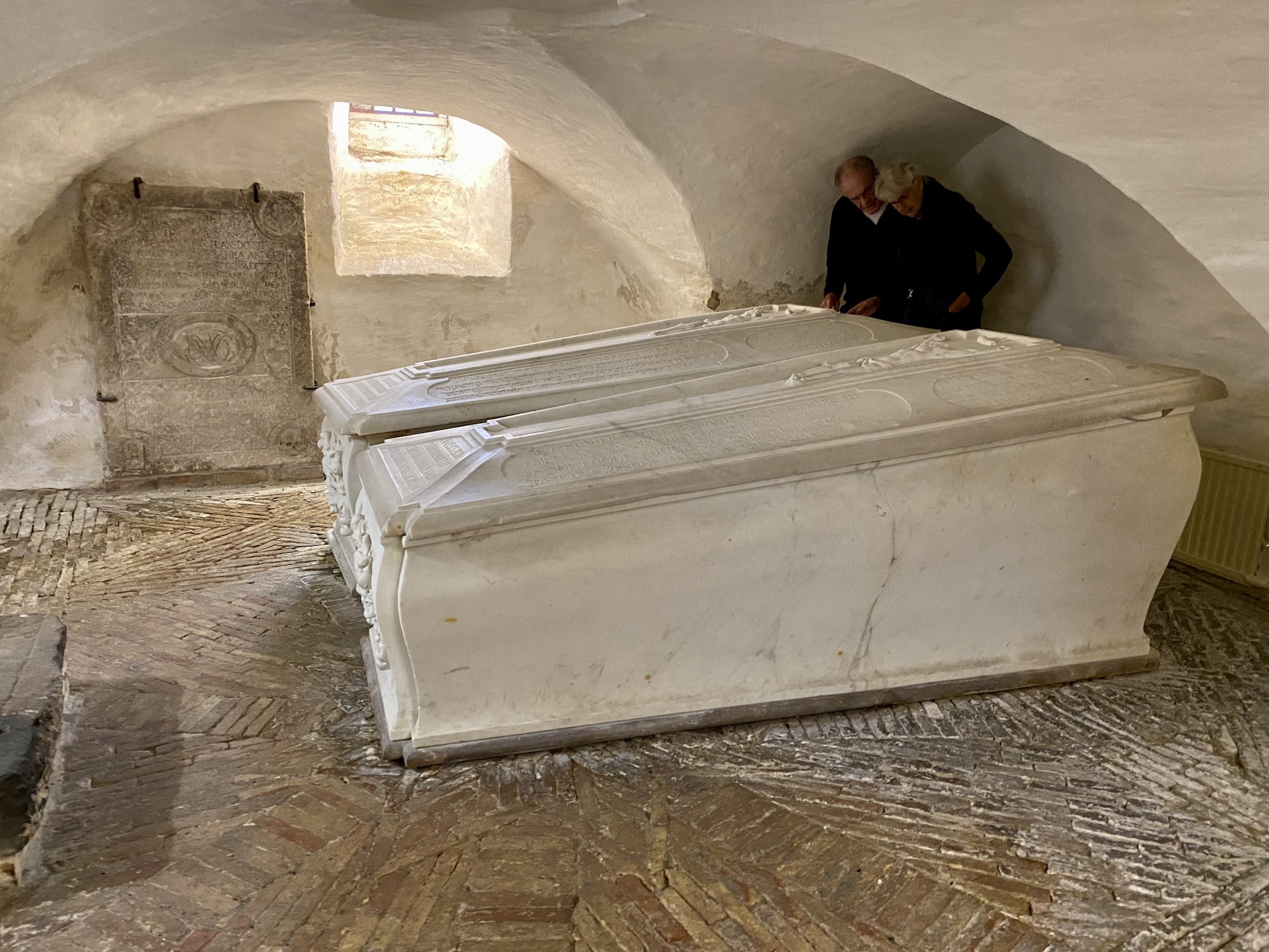 ...ligger två stora marmorkistor, "Wälförordnade Commendeur til siös.Den wälborne Herren Herr Lars Gathenhielm" (Stora ja - han mätte 162 cm)