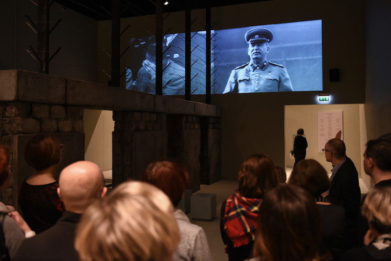 Det sista rummet i museet är tudelat - en mur som delar öst och väst, och journalfilmer som visar vad som hände efter kriget...på båda sidorna om järnridån.