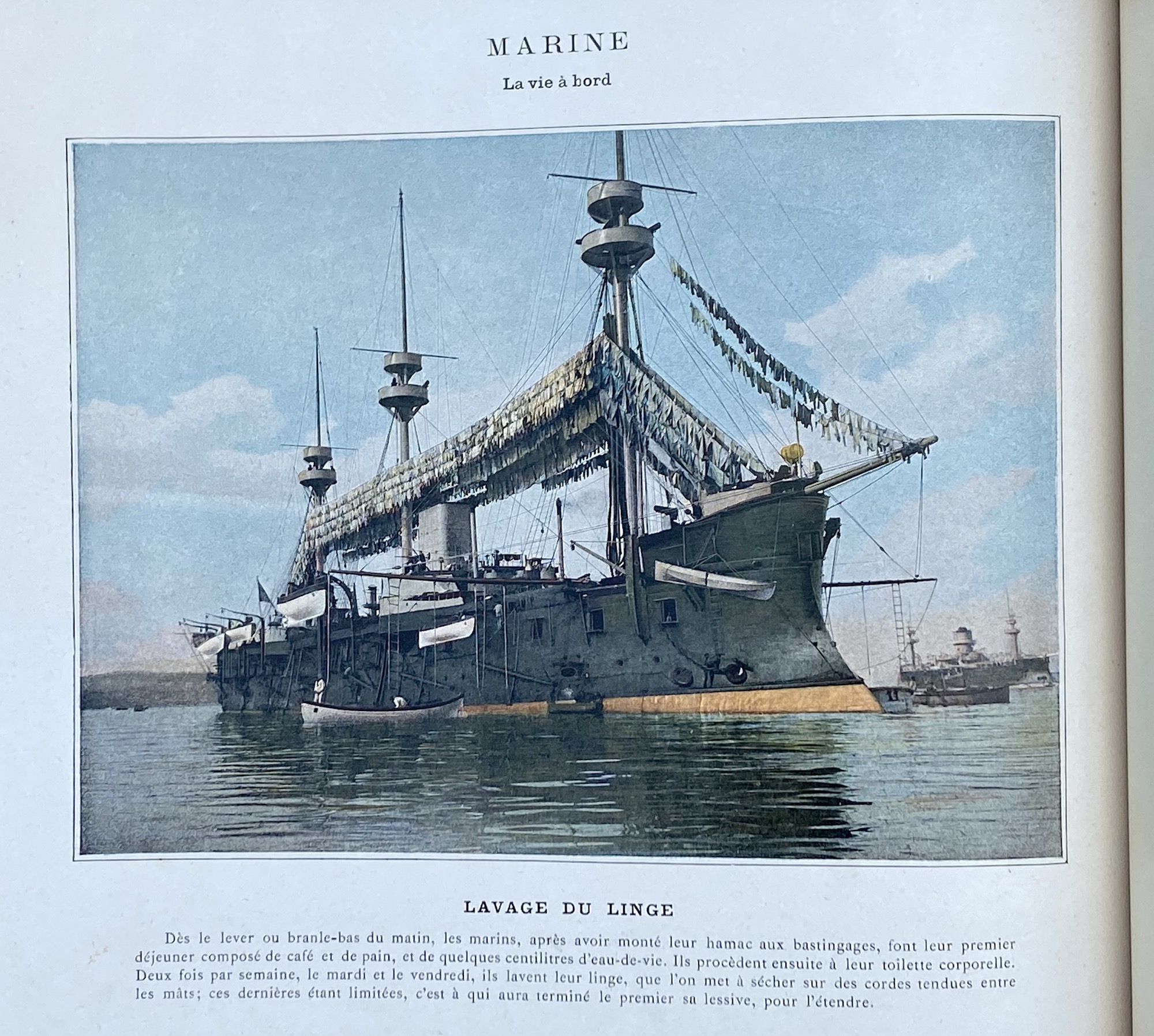 Marinsoldatens tvätt blir upphängd mellan masterna, varje tisdag och fredag, som det står i texten. Där vi också hittar den dagliga frukostmenyn ombord: kaffe och bröd...och några centiliter eau-de-vie!