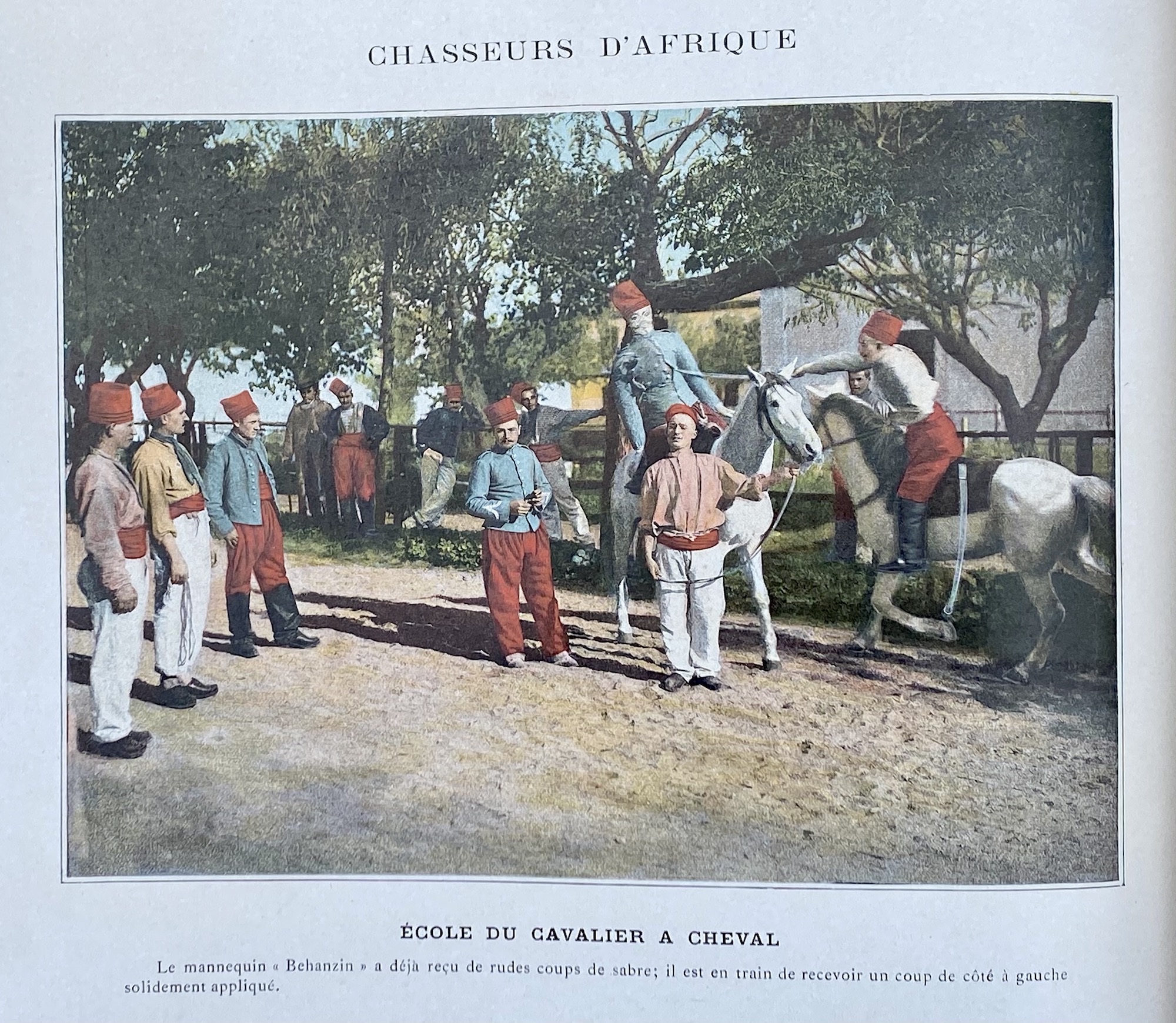 Afrikanska kolonier hade Frankrike fortfarande vid den tiden, konflikter fanns det nog av, så här lär man hur motståndaren skulle stickas ner - i detta fallet en mannekäng som av någon anledning fått namnet "Behanzin"...!?