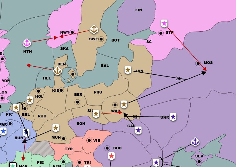 Här är standarddrag till öppning, problemet är att Ryssland är det enda land som kanske inte får något nytt område. Om Tysklands flotta går till Danmark kan den sedan stoppa den ryska flottan från att inta Sverige. På samma vis är det inte säkert att man lyckas inte Rumänien.